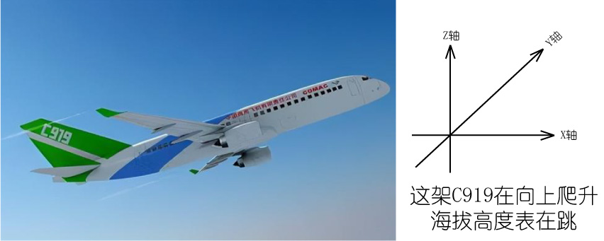**物理:**陽光灑在這架C919的機體上,折射出漂亮的光芒,它在向視野的右邊加速起飛,越來越快,感覺比高速公路上的汽車要快,儀表上,顯示速度的數字在跳動,150,200,230,260.…騰的一下,C919飛起來了,它的高度越來越高,海拔顯示是200,500,1000.…逐漸消失在視野中。