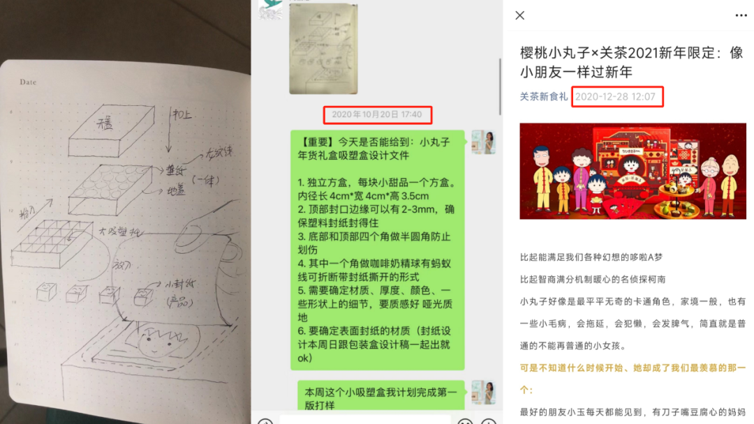 (圖為關茶2020年禮盲盒結構設計初稿;小關與設計師聊天記錄;小丸子盲盒上線時間)