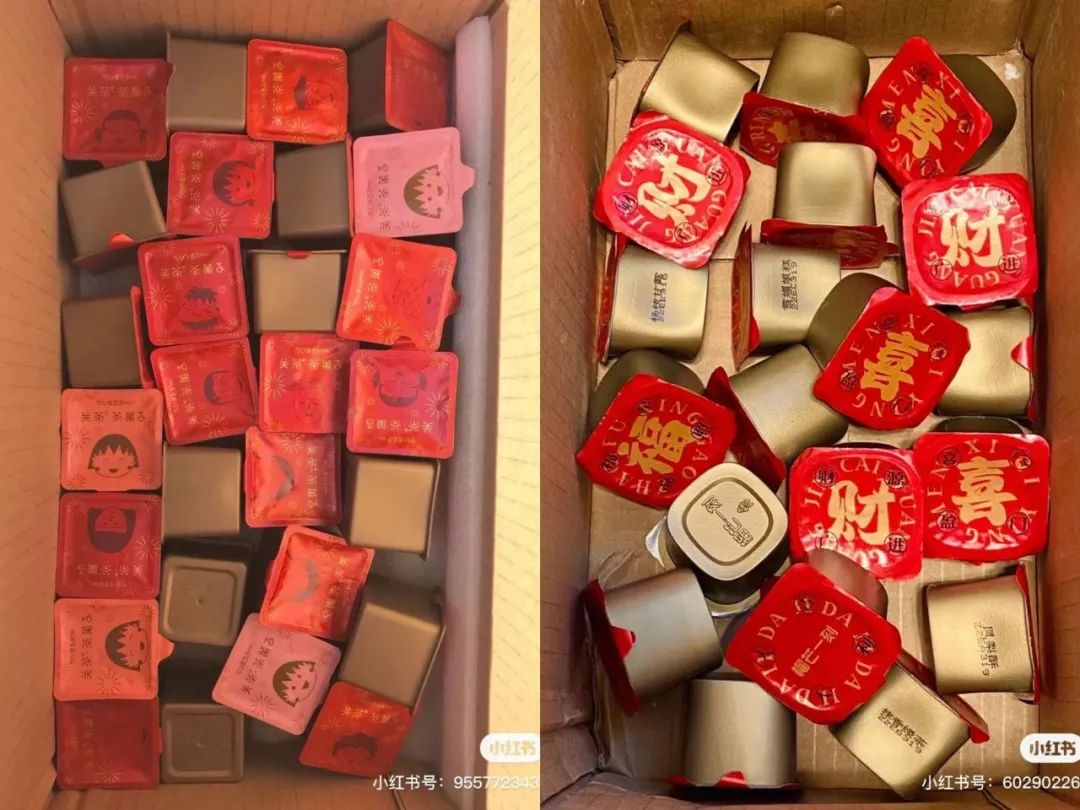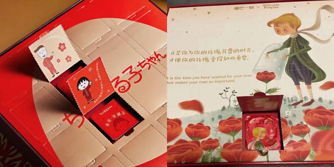 然而,在2022年末,老三的出現卻宛如給了我“重拳一擊”——榴芒一刻上線了一個系列的新年甜品盲盒,其中有小王子(非正版)聯名款和國潮款,從裏到外,從文化創意到內外包裝結構,跟關茶的產品如出一轍,甚至連糕點和巧克力的外觀都一樣。