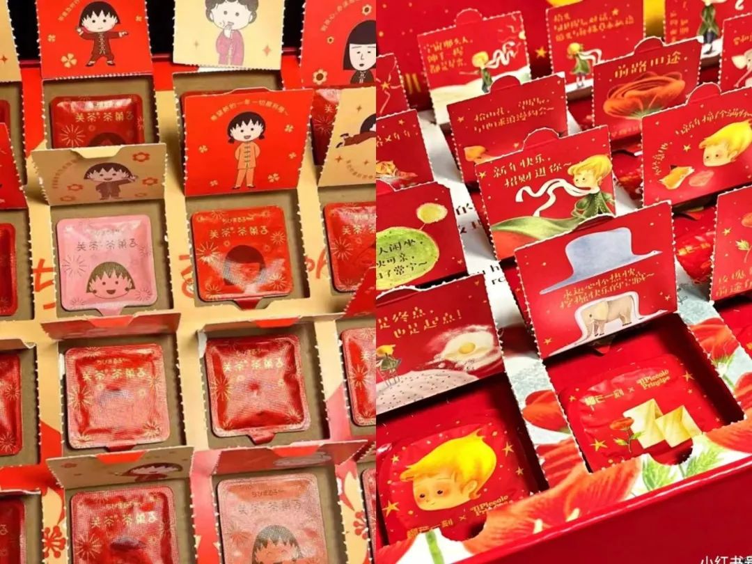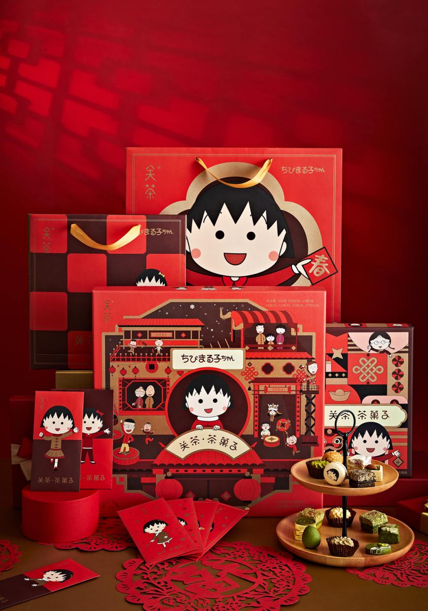 **2020年末,**關茶聯名正版IP櫻桃小丸子,開發了新年甜品盲盒,每一個產品包裝的結構、細節,內部糕點和巧克力的外觀都是設計師親筆一點一點畫出來的。