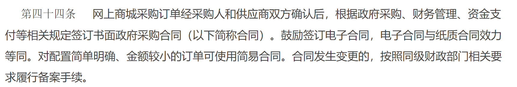 值得一提的是,為進一步優化營商環境,《辦法》將大量行之有效的政策、經驗、做法上升到法規制度,使其進一步系統化、規範化。如,《辦法》提出鼓勵簽訂電子合同,電子合同與紙質合同效力等同,且配置簡單明確、金額較小的訂單可使用簡易合同,明確電子合同效力,簡化政府採購合同簽訂工作。同時,《辦法》明確質疑投訴管理規則,暢通商城供應商權益救濟渠道;明確禁止收費要求,降低制度性交易成本;明確標準化管理原則,進一步提高對供應商的服務水平。