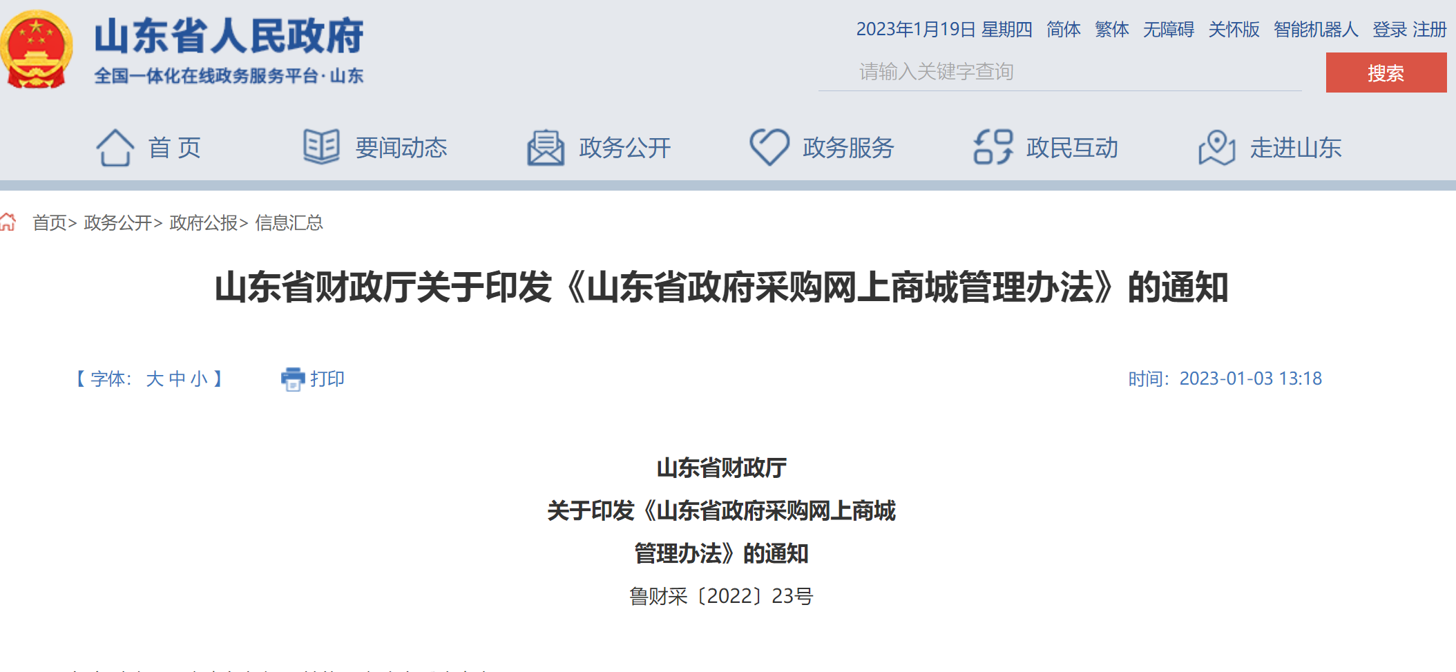 近日,山東省印發《山東省政府採購網上商城管理辦法》(以下簡稱《辦法》),進一步規範網上商城運行機制,推動政府採購網上商城管理再上新台階。
