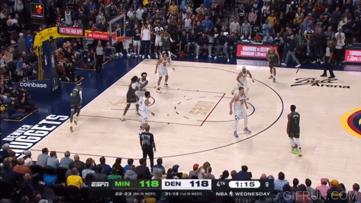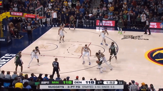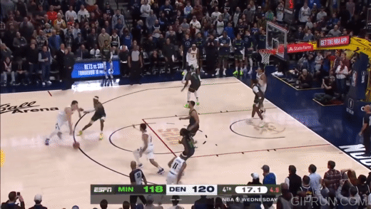 穆雷投中領先球,森林狼邊線罰球,約基奇主動夾擊,穆雷輪轉,逼得森林狼傳球失誤,只剩8秒。