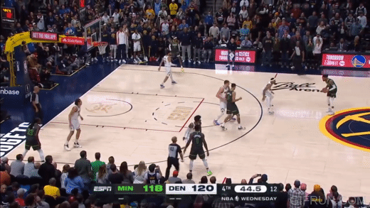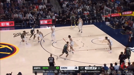 下一回合,又是約基奇被點名換防,掘金又是主動夾擊輪轉,最後森林狼找不到機會,拉塞爾投丟了事。