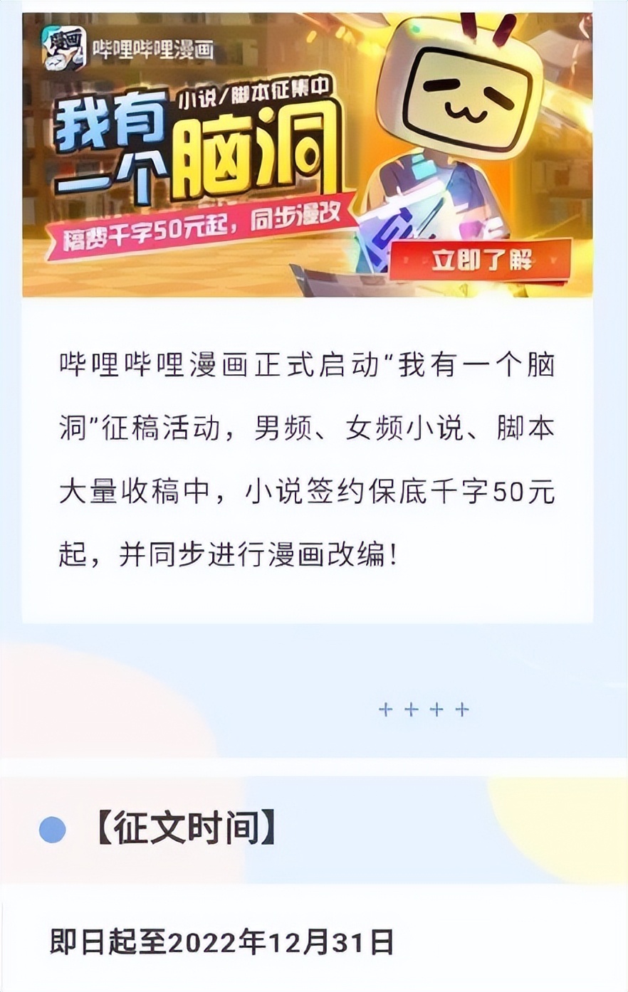 為了增強自身打造IP的能力,降低對於海外漫畫作品的依賴,嗶哩嗶哩漫畫也曾採取了一些為平台培養創作者的策略,比如2022年上半年,嗶哩嗶哩漫畫就推出過持續到年末的小説/腳本徵集活動,徵稿範圍包括男性向和女性向多個題材,並表示將同步對作品進行漫畫改編。