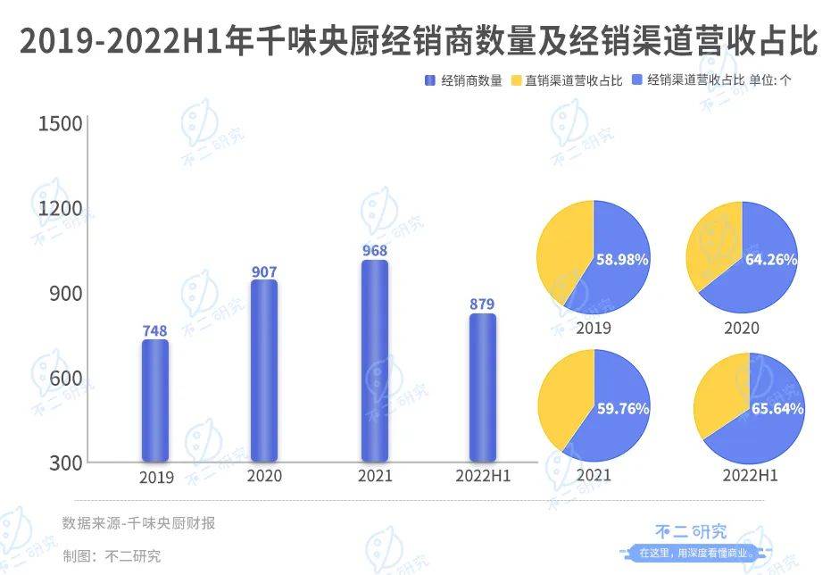 其中核心原因除了2020年大B用户受疫情影響較嚴重導致需求下降外,千味央廚經銷商個數的快速上升亦功不可沒。據其招股書及財報顯示,2019-2022上半年,千味央廚經銷商數量由606個迅速攀升至879個。