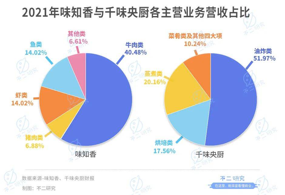 而千味央廚的產品則以速凍米麪製品為主。據其招股書介紹,千味央廚將其產品分為油炸品、烘焙類、蒸煮類、菜餚類及其他四大項,2021年這四大品類所取得營收佔其營收比例為51.85%,17.53%,20.06%,10.22%。油炸類產品為其主要業務。
