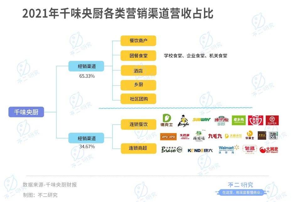 而千味央廚則專注B端市場。以直銷渠道綁定大B客户,經銷渠道下沉中小餐飲客户。在直銷渠道方面,千味央廚主要銷售定製產品給連鎖餐飲及連鎖商超等大B客户,百勝中國、華萊士、九毛九、真功夫、海底撈等均為其客户。經銷渠道則多為通用產品,主要依託經銷商對餐飲商户、團餐食堂、酒店、鄉廚等終端客户進行銷售。2021年經銷渠道和直銷渠道佔其營收的比例分別為65.33%和34.67%。
