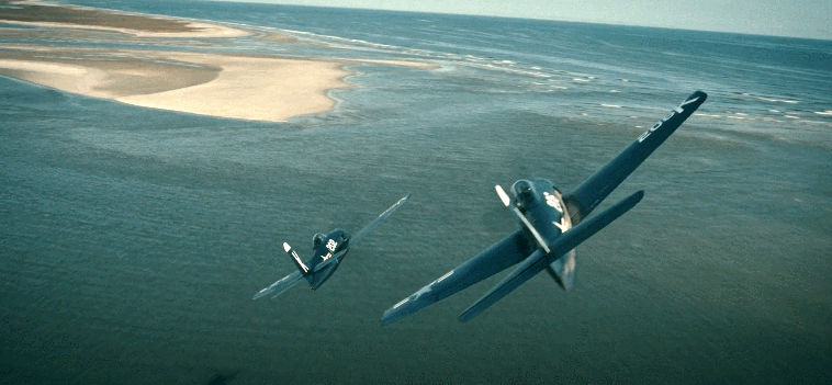 這也是整個行為藝術的高潮所在,我個人強烈懷疑這裏是導演有關美日之間的海戰電影看多了,愣是讓主角開着F4U海盜掛載無制導火箭彈,上演了一出魚雷機超低空突襲日本戰列艦的戲碼。