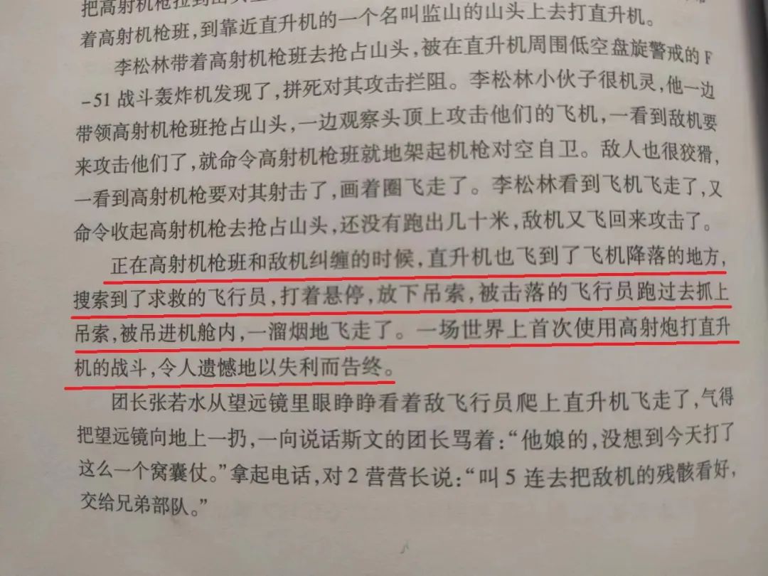 美軍隨後派來直升機準備營救飛行員,我軍隨即組織高炮對空射擊,但是尷尬的情況出現了,我軍高炮部隊射手在當時均沒有見識過直升機,也沒有培訓過對直升機的射擊要領,這使得我軍高炮配備的指揮儀無法測出敵人直升機的速度,也就無法為高射炮裝訂正確的射擊參數。2營4、5兩個高炮連的幾輪射擊均無法擊中敵直升機,而我軍派出意圖近距離射擊敵機的的高射機槍小組,也被敵軍F-51戰機糾纏,最後只能目送美軍直升機搜救成功之後飛離戰場……留下了一個小遺憾。