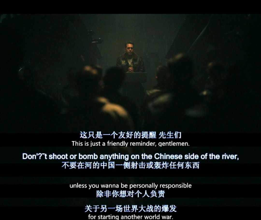 該片戰爭場面的開端,是主角團們駕駛戰機從航空母艦上出發,空襲鴨綠江上的橋樑和朝鮮新義州中朝一方的物資囤積點與防空炮。在執行任務前的簡報環節,美軍還特意強調了一番“不得攻擊鴨綠江中國一側”的紀律要求,顯然,這是在凸顯美國在當時對維護地區局勢與和平所作出的“極致努力”。