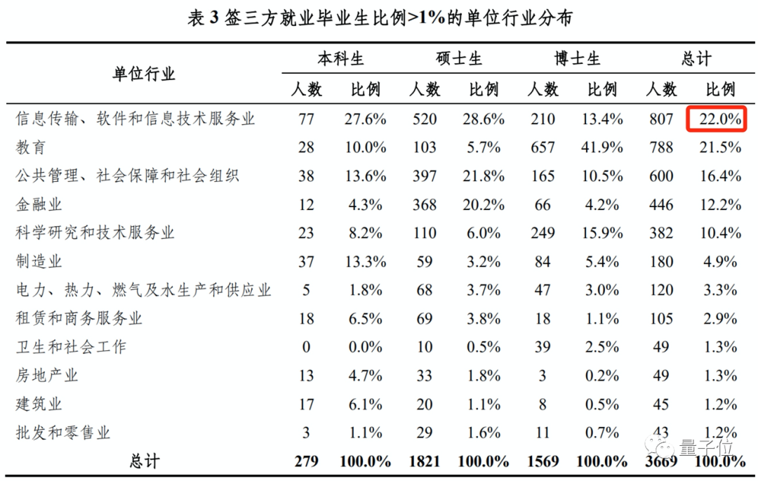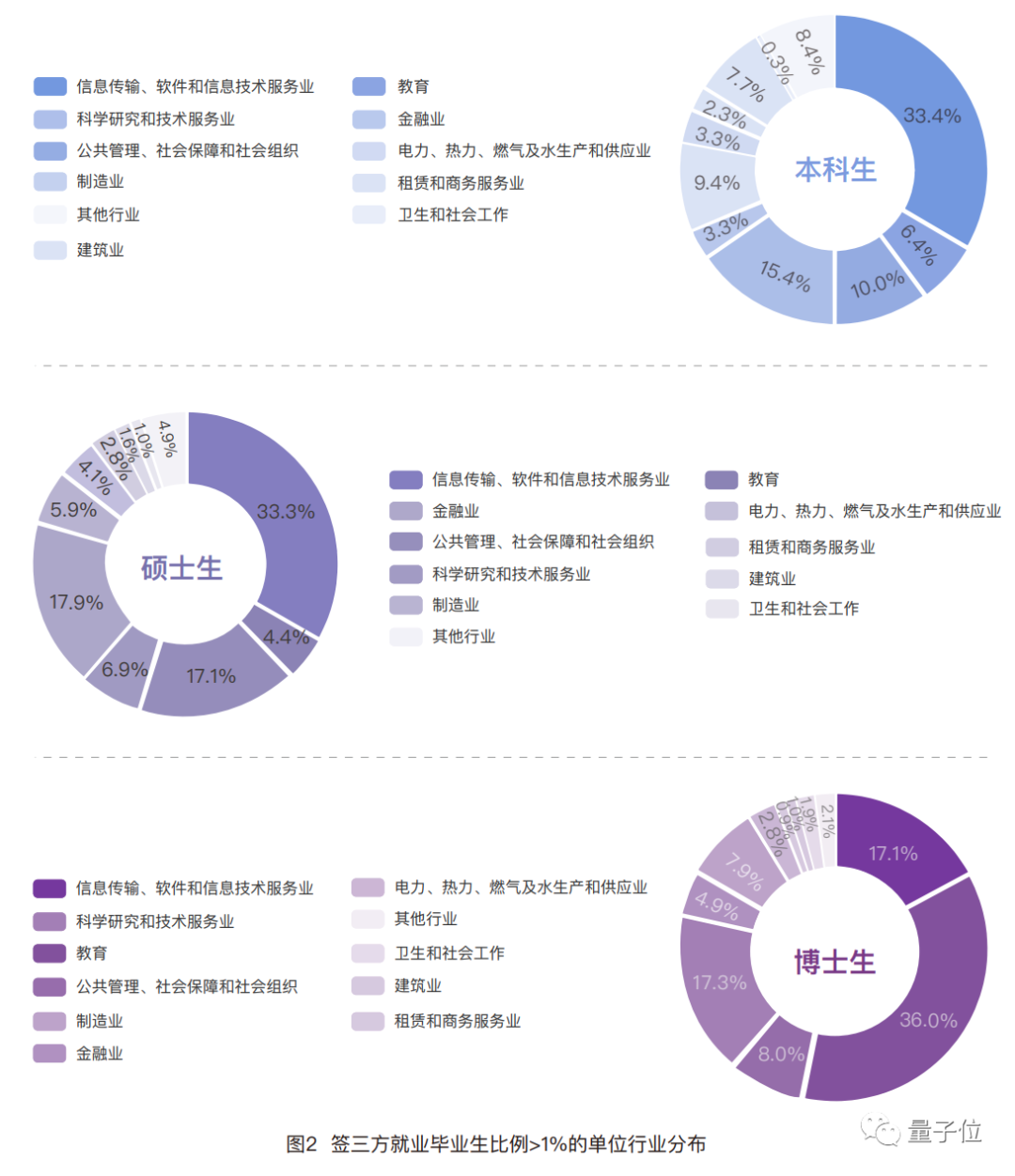 在本碩博就業畢業生中,進入“信息傳輸、軟件和信息技術服務業”的比例分別是:33.4%、33.3%和36.0%,均超過三分之一。