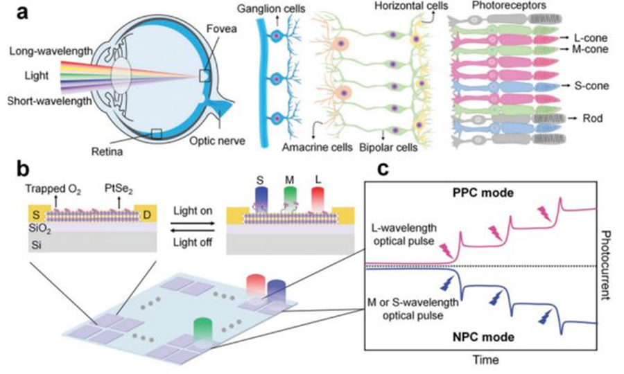 在這樣的情況下,受到人類視網膜顏色自適應的啓發,近日,國防科技大學的研究人員宣佈,他們利用了****2D材料製作了一種具有信號傳感、記憶和處理能力的仿生視網膜形變裝置,實現了自發的顏色適應。
