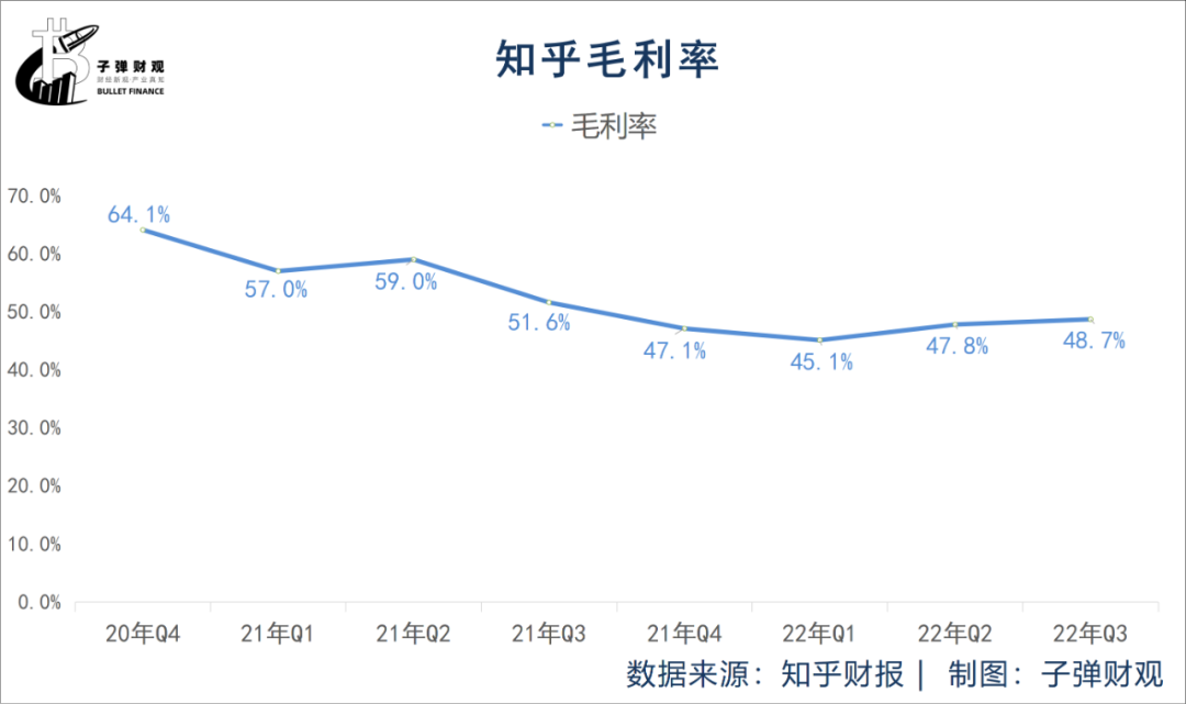 **最後,知乎的毛利率也呈總體下滑的勢頭。**根據已公開的財報,最近8個財季(2020年Q4-2022年Q3),知乎的毛利率分別為64.1%、57.0%、59.0%、51.6%、47.1%、45.1%、47.8%和48.7%。