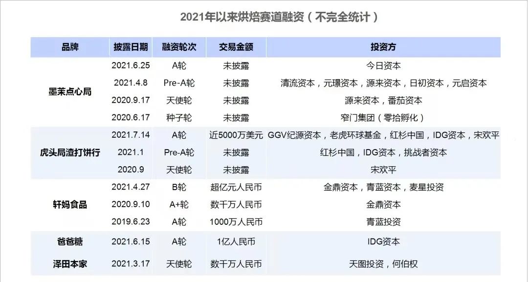 為了搶佔先機,資本更是排着隊送錢。2020年6月成立的墨茉點心局,在成立不過一年時間裏,一口氣拿到了五輪融資,頻率之高,讓人瞠目。