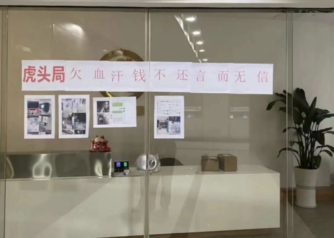照片中辦公室大門緊閉,裏面空無一人,門上赫然貼着“虎頭局欠血汗錢不還言而無信”的血紅大字。