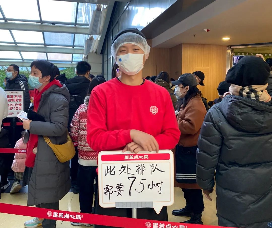 2021年11月,前腳虎頭局渣打餅行在北京華熙LIVE·五棵松設立首店,不少人從五環外趕來,單單路上就要花費2小時;後腳墨茉點心局於12月在西單大悦城高調開張,店員提示等待時長的牌子,從3小時一路加到7.5小時。