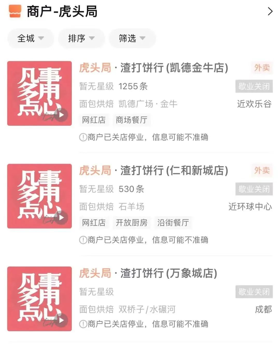 而就在剛剛過去的12月,虎頭局關閉了在重慶和成都所開出的全部門店,品牌創始地長沙的門店只剩下3家,北京的10家門店也已悉數關閉。
