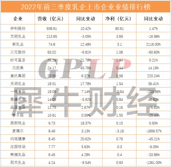 2022年前三季度,18家上市乳企實現營收總額超1490億元,淨利超93億元。其中,蒙牛由於尚未公佈三季度財報,故不在此列。