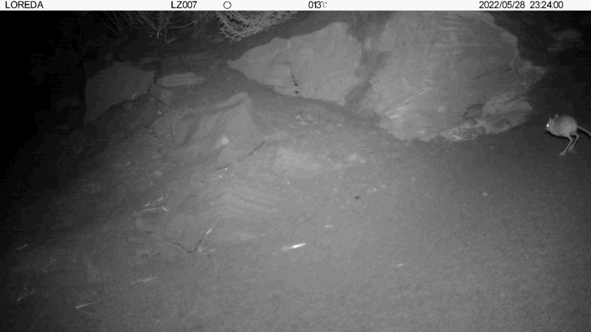 不用望遠鏡不用夜視儀,它就趴在離車不到兩米的路邊的豬毛菜裏。看見車燈它的第一反應是趴下攤平,利用植被的遮蔽掩護自己,希望沒人注意到它;可惜我們車速太快沒能第一時間剎住車,倒車回去的那一下讓它意識到自己暴露了,於是緊貼着地面迅速地出溜走了,遁入黑夜裏,不見蹤影了。