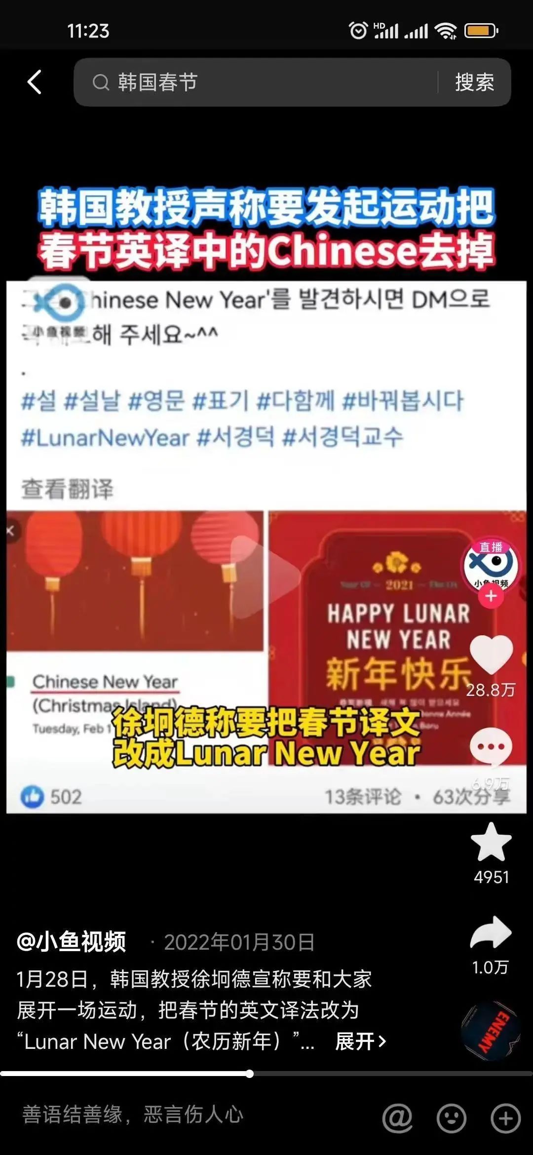 那個曾“碰瓷”抗議過泡菜、參雞湯、中國朝鮮族服飾百度詞條,來自韓國誠信女子大學的教授徐坰德突然在臉書上宣稱,他想和大家一起展開一場“運動”,把即將到來的春節的英文譯法改為“Lunar New Year(農曆新年)”。