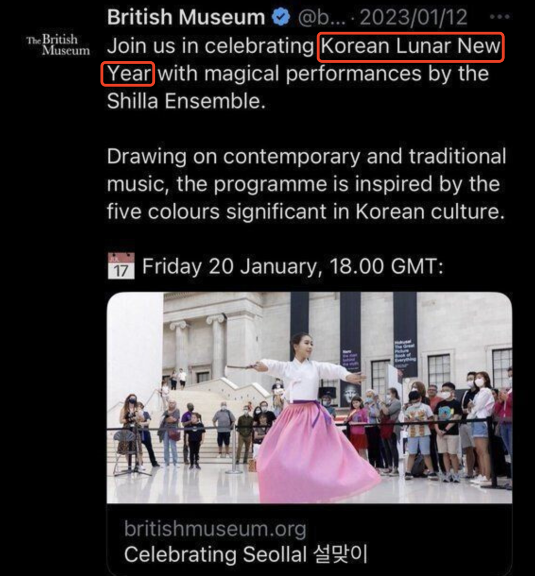 大英博物館為宣傳韓國旅遊局舉辦的一活動在官方賬號發文慶祝“韓國農曆新年”。