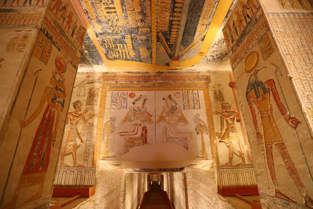 這是2022年4月26日在埃及盧克索帝王谷拍攝的法老拉美西斯六世陵墓內的浮雕和壁畫。新華社記者 隋先凱 攝