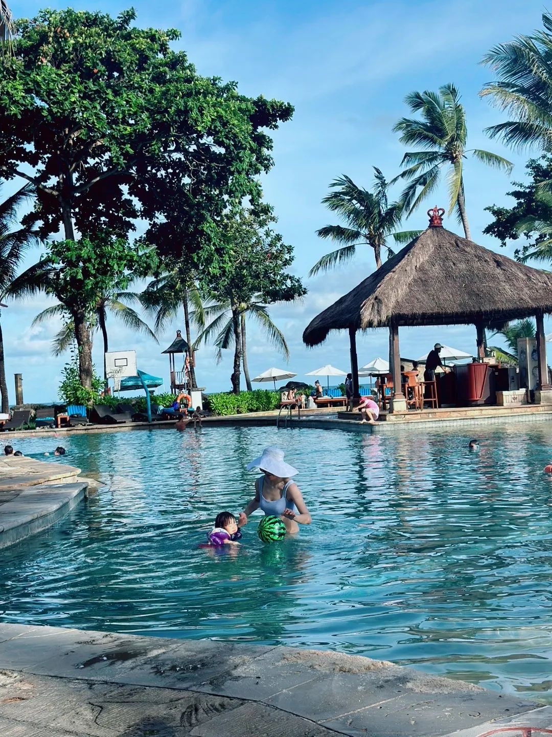 現在,我的兩個小孩剛剛在游泳池裏撲騰裏一上午,他們嚷着餓了,要吃飯。