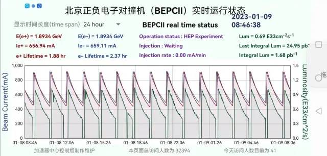 實驗結果下半部分的圖表,顯示了加速器裏面正負電子的束流強度隨時間變化的曲線。
