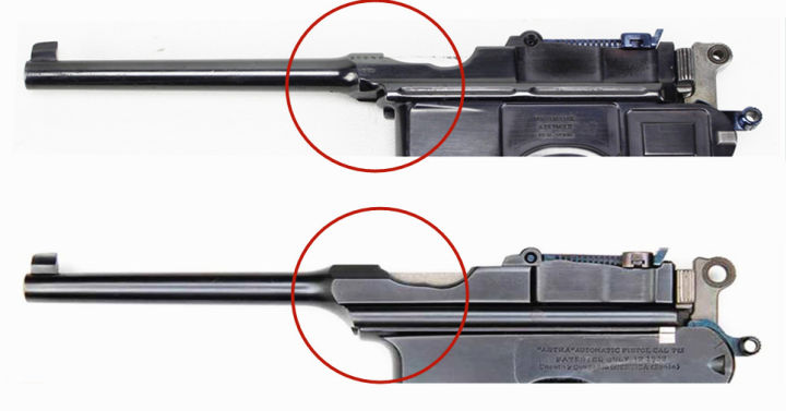 也簡單,看輪廓就行。相對於彈(匣)倉的前沿,毛瑟C96和阿900的槍機節套都有一個向前的突出,但突出部位的長短粗細並不一樣,前者突出略短,後者突出略長;前者細,後者粗。只要對駁殼槍感興趣,多看幾遍,用肉眼一眼即可看得十分分明。