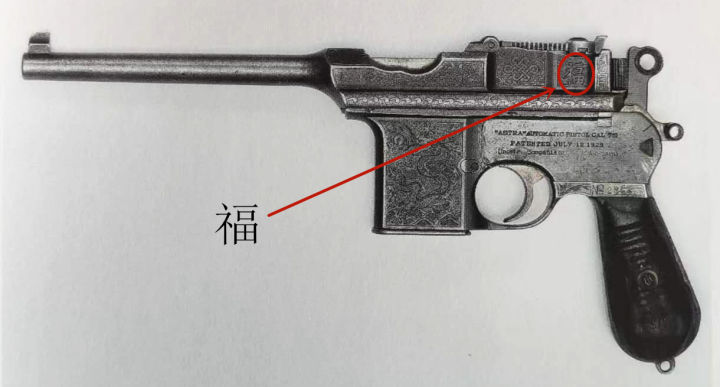 如果單從該槍的左側看,外凸的彈匣倉、旁開門、開門上的銘文,160毫米的槍管,很像是903、904或F、E式。令人驚奇的是槍機節套的左側,卻銘刻着一個漢字,一個“福”字,當然這與槍的形制並沒有什麼關係。