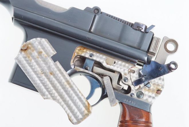 有哪些不同呢?其一,是可以從旁打開的機匣側板,這是毛瑟手槍沒有的。請看圖: