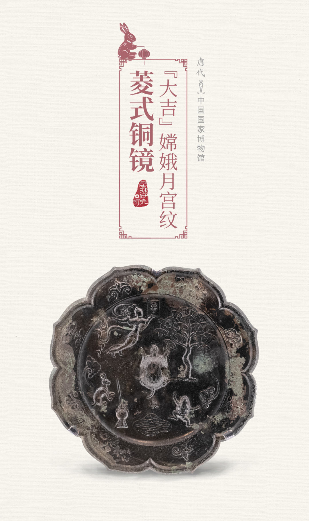 (中國國家博物館藏唐“大吉”嫦娥月宮紋菱式銅鏡,唐代流行將嫦娥與玉兔的形象共同裝飾於銅鏡之上,攝影師@柳葉氘、製圖@馮藝卓/星球研究所)