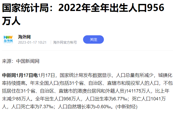 5天之前的1月17日,國家統計局發佈數據,2022年中國人口減少85萬,如果加上還沒全面彙總的12月死亡案例,最終數字可能會大於100萬。上一個中國人口負增長時代,是1960年和1961年,再上一次,可能要追溯到抗日戰爭或者是太平天國。