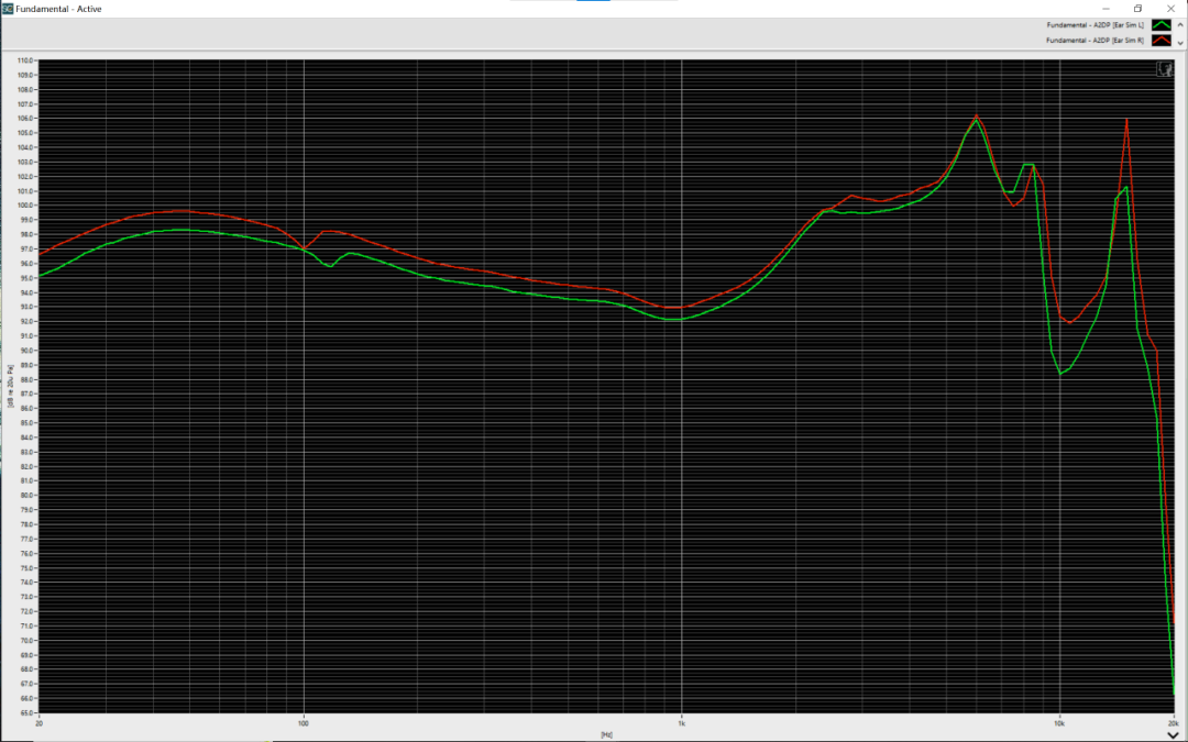 聲音的頻響曲線方面,FreeBuds Pro 2 的左右耳( 綠線為左耳、紅線為右耳 )差別不大。
