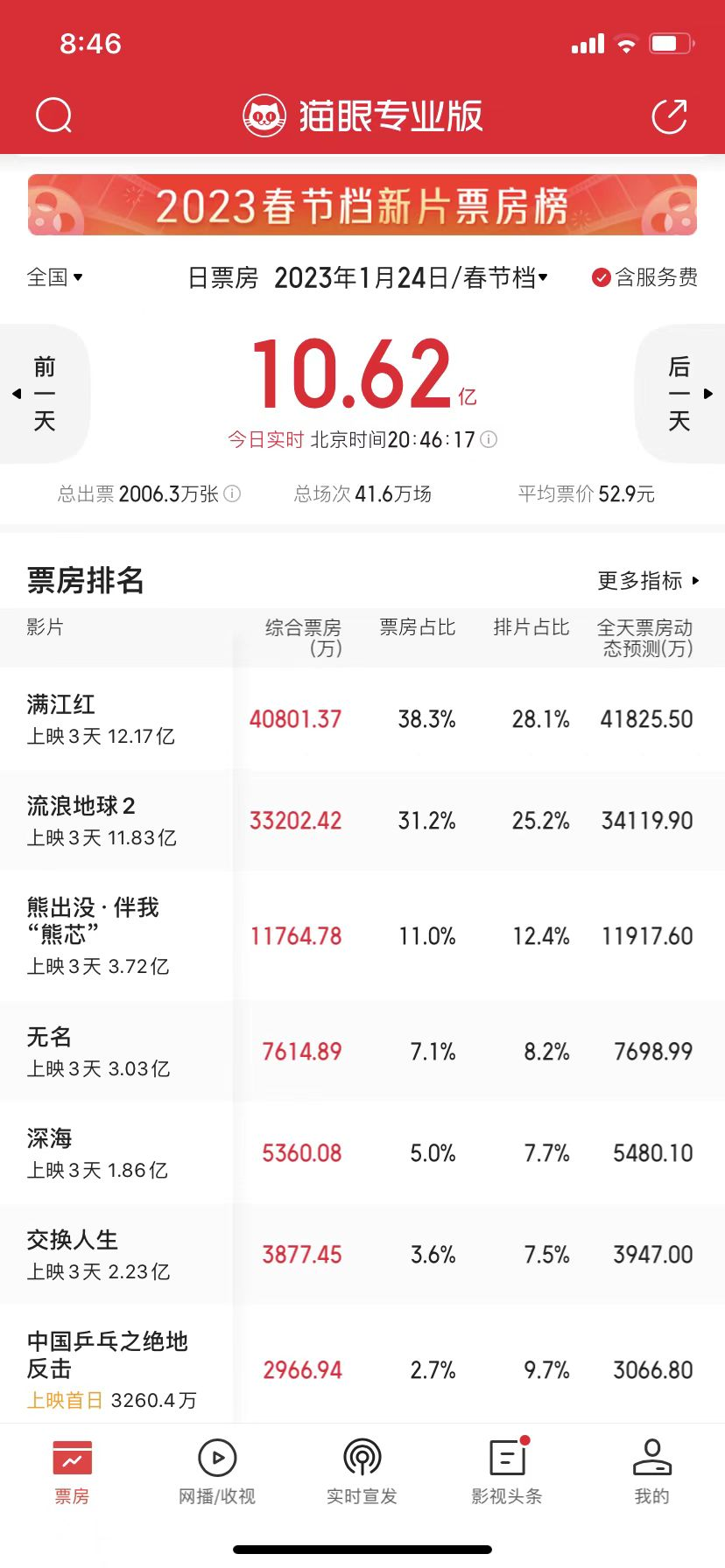 貓眼專業版數據顯示,截至24日15時19分,2023年春節檔**總票房(含預售)超35億元。**今日《滿江紅》《流浪地球2》《熊出沒·伴我“熊芯”》分列票房榜前三位。從走勢看來,春節檔最終票房將落在一個相對可觀的數字,行業回血有望。