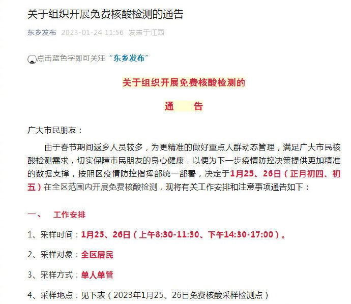 據“東鄉發佈”消息,撫州市東鄉區新冠肺炎疫情防控應急指揮部辦公室1月24日中午發佈通告:為更精準的做好重點人羣動態管理,滿足廣大市民核酸檢測需求,切實保障市民朋友的身心健康,以便為下一步疫情防控決策提供更加精準的數據支撐,決定於1月25、26日(正月初四、初五)在全區範圍內開展免費核酸檢測。