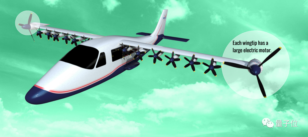 為配合供能系統,團隊又將傳統的兩個大型發動機設計,變成了——14個小型發動機均勻分佈在機翼兩側。這是該飛機的又一大挑戰性特徵。