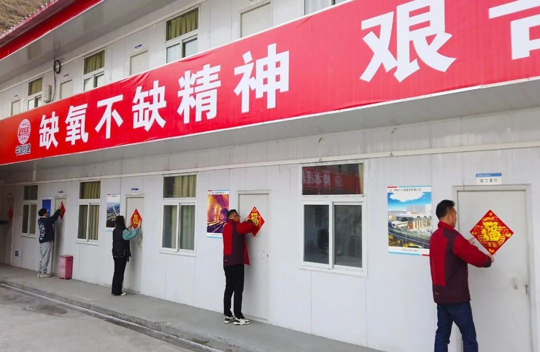 從德勝隧道回到指揮部駐地,員工們正在吹氣球、貼福字,熱鬧歡騰。