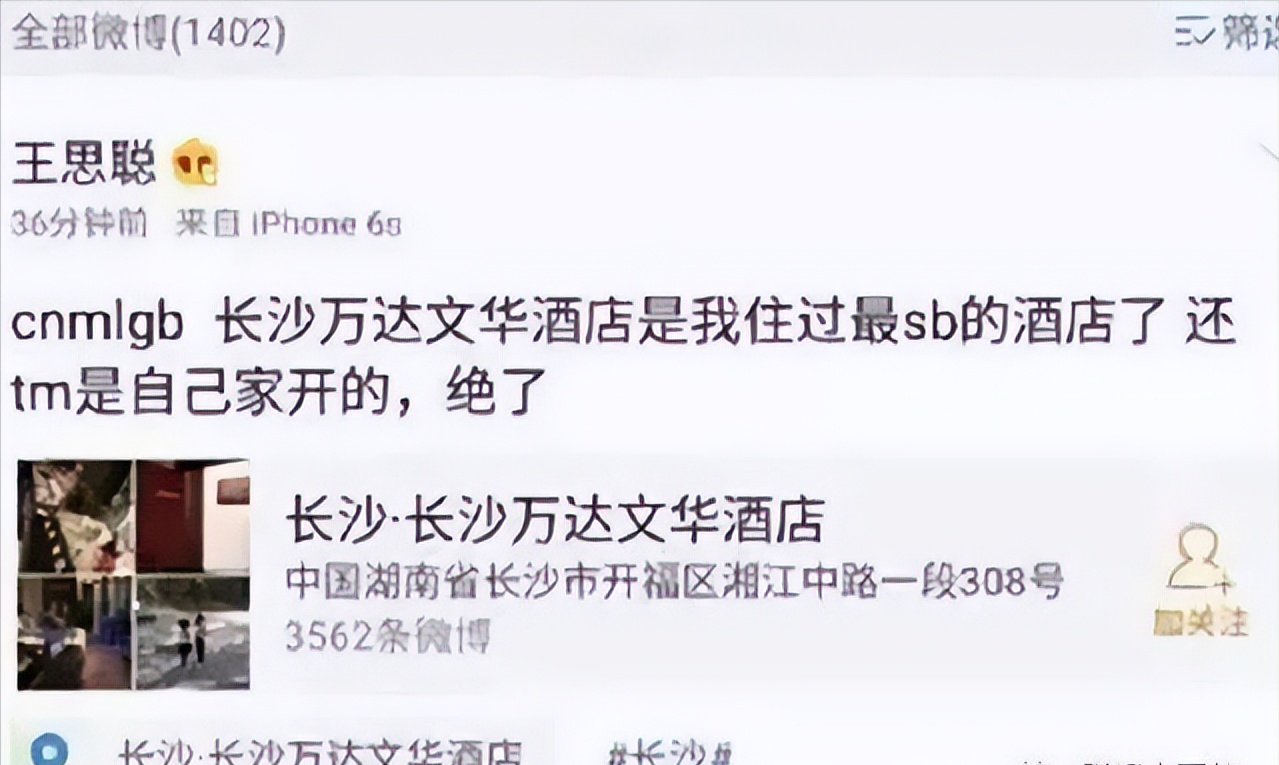 讓王思聰沒有想到的是,在萬達文華酒店的衞生間裏,居然沒有放置衞生紙。要知道,萬達酒店都是五星級酒店啊!萬達集團的五星級酒店,居然出現衞生間沒有衞生紙這種事情,確實讓王思聰大為不滿。他就用他的蘋果手機6S(當年那是最先進的)發了一條這樣的微博:“cnmlgb(這是一句嚴重的粗口),長沙萬達文華酒店是我住過最sb的酒店了,還tm是自己家開的,絕了!”王思聰的微博,很少用標點符號,都是用空格。