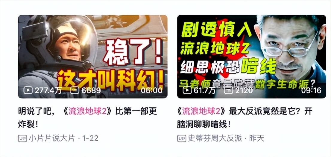**春節檔開啓三天,但B站上已經出現不少春節檔電影相關內容。**如UP主“小片片説大片”對《流浪地球2》的解説視頻【明説了吧,《流浪地球2》比第一部更炸裂!】,深度分析電影的長鏡頭,太空電梯特效呈現等,視頻播放量達到277萬,而UP主“利維坦”對《流浪地球2》預告的逐幀解析視頻,深挖每一個畫面裏預埋的細節彩蛋,播放量接近170萬。