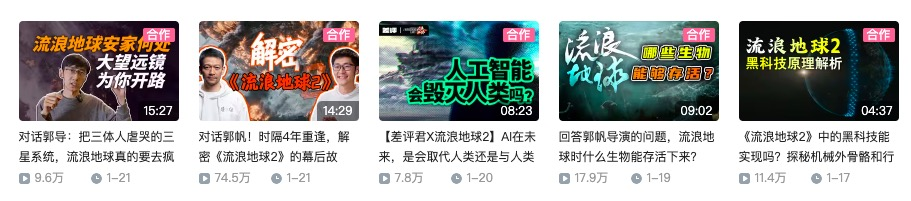 郭帆與UP主“影視颶風”的對談視頻,15分鐘左右,從特效製作、故事節奏、虛擬拍攝到電影宏觀體積感的塑造、月球發動機的設計等,針對電影細節進行討論,讓觀眾直觀感受到電影背後投注的精力。評論區有B站用户評價,“電影到最後實質上是一門工業與科學。”