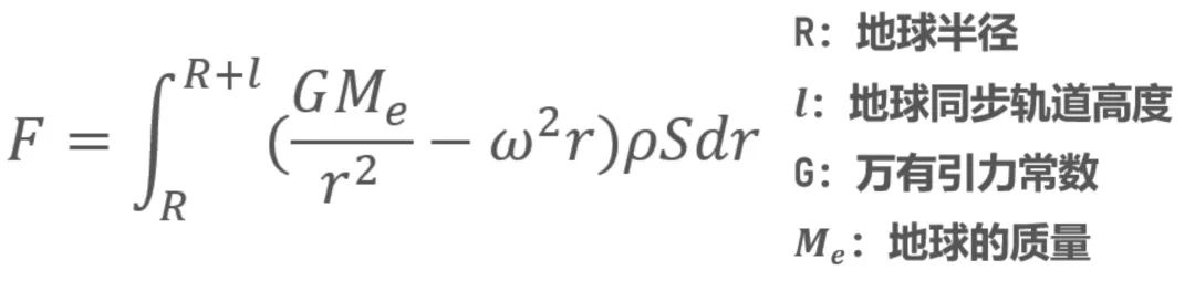 在地心參考系中,將纜繩簡化成圓柱狀,密度是ρ,橫截面是S,一端固定於地球同步衞星,另一端固定於赤道海上基地。考慮在同步衞星軌道附近的一小段纜繩,不考慮各種額外的載重,它受到的拉力可以這樣計算: