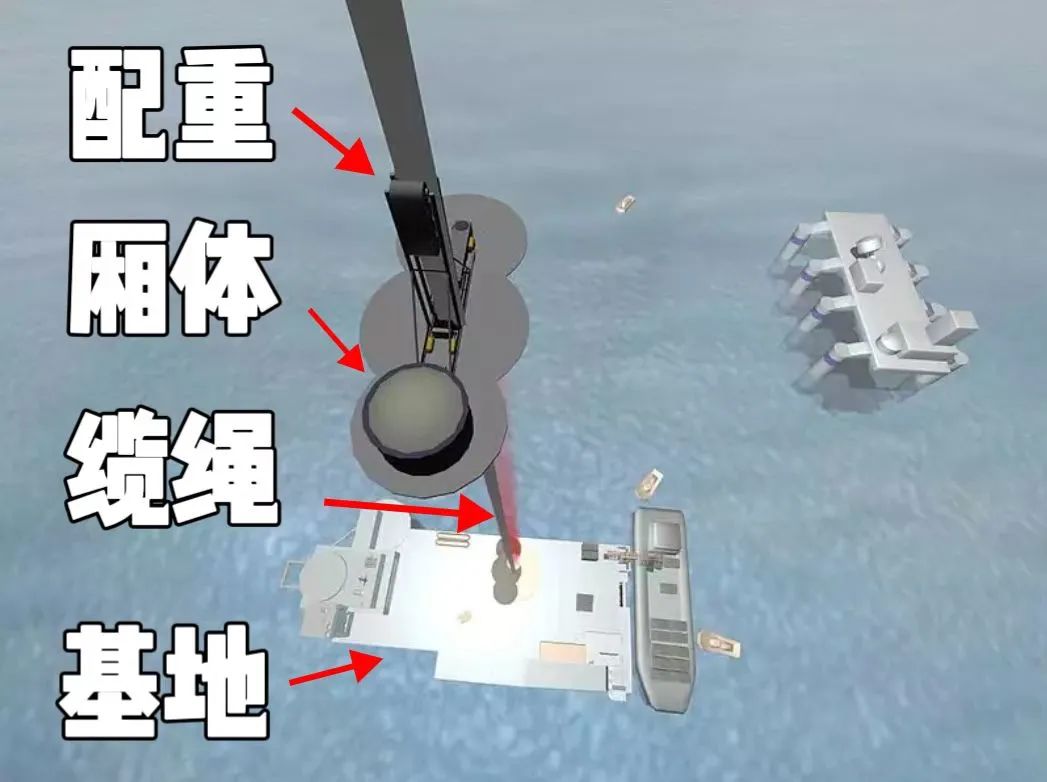 電梯的廂體、廂體上下運動所需的纜繩軌道、用於在地球端固定纜繩的海上基地,以及配重。