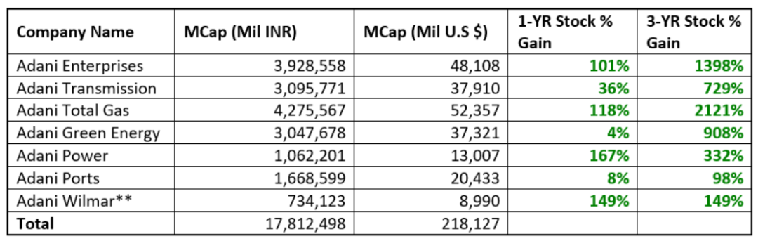 在過去3年中,阿達尼的7家主要上市公司的股票價格神秘地飆升,大多數都增長了數倍,使它們分別躋身於印度最大的公司。阿達尼企業和阿達尼港口都是印度Nifty 50指數的一部分,其中6家公司被納入MSCI印度指數。