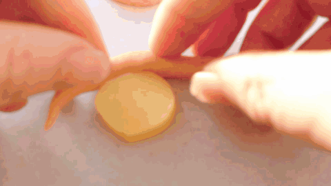 兔臉面團應該已經定型成有點硬度的圓柱體了,取出切成0.5cm的薄片。