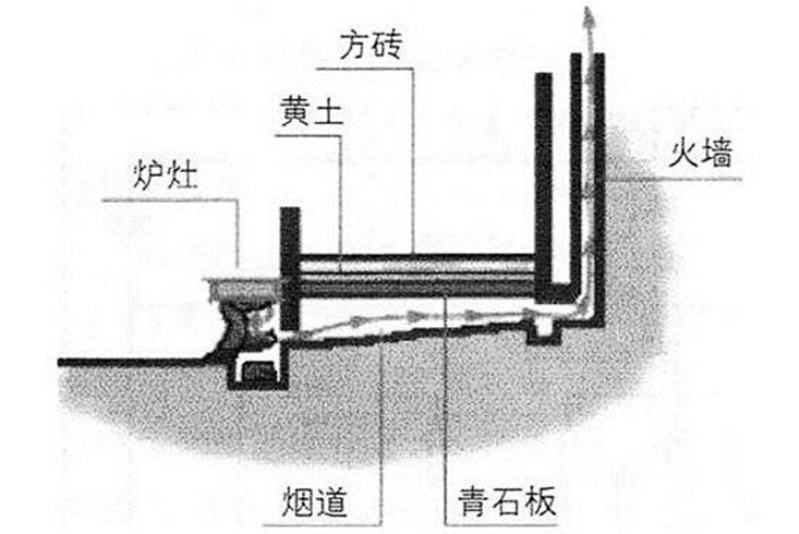 西北地區在設計平房的時候就會考慮火牆的位置,將兩個房間中間的一堵牆設計成中空的,並用小土塊砌成迷宮一樣的煙道,房頂就是煙囱,牆的下方有爐子,或者是通過地板下方連接廚房的爐灶。由於煙囱效應,冷空氣從下面鑽到爐子裏面,使煤炭燒得很旺,煙氣經過迷宮一樣的火牆,通過熱對流加熱牆壁,牆壁以熱輻射的形式提升室內温度,達到取暖的目的。