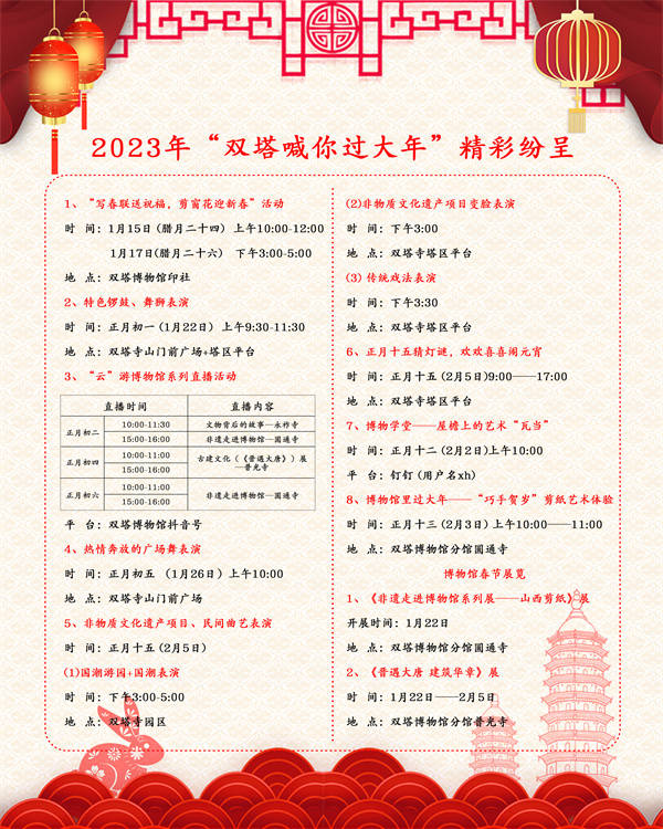 春節期間,雙塔博物館為弘揚中華傳統文化,不斷地豐富和活躍羣眾文化生活。雙塔博物館結合傳統民俗文化,融合時代元素,推出系列活動,各類民俗表演、非遺文化、鑼鼓表演、兔兔合影拍照、“雲”遊博物館直播活動、雙塔邀你過大年現場直播活動、開展紅色教育和國情教育,發揚好紅色傳統、傳承好紅色基因等系列活動,置身雙塔博物館感受濃濃的年味。