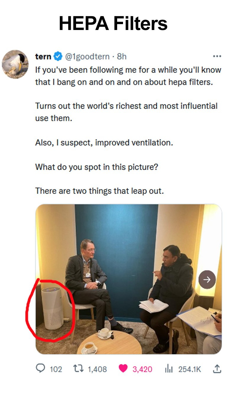 我們來看看達官顯貴們齊聚的達沃斯論壇是怎麼搞防疫的。大部分公開的照片上,我們看到達官顯貴們並沒有佩戴口罩,但是請注意,一些拍攝角度沒有控制好的圖片裏出現了HEPA(High-Efficiency Particulate Air-filter,高效空氣微粒過濾)系統,通常就擺放在大人物的邊上。