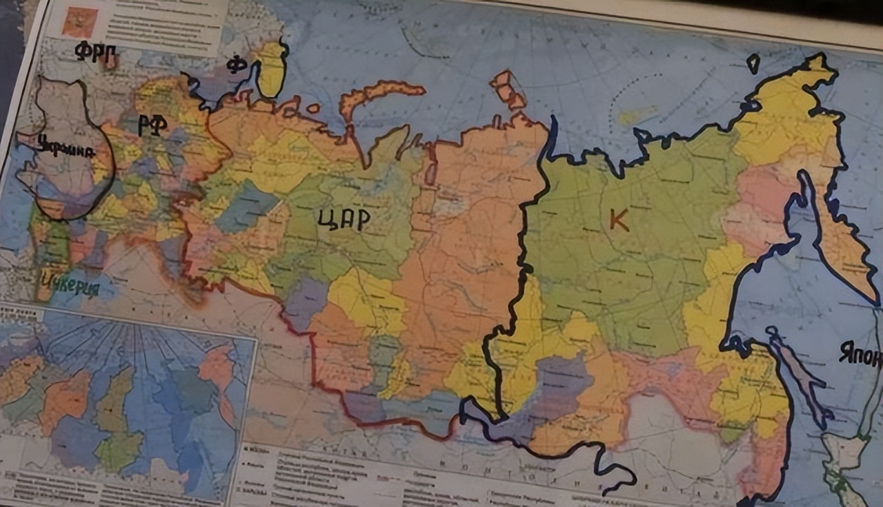 烏克蘭情報部門負責人基里爾·布達諾夫的辦公室裏,掛着一張關於“如何瓜分俄羅斯”的地圖,地圖中標註的大概意思就是,將俄領土大致劃分為6個區域,並且將這幾個區域進行了分配。